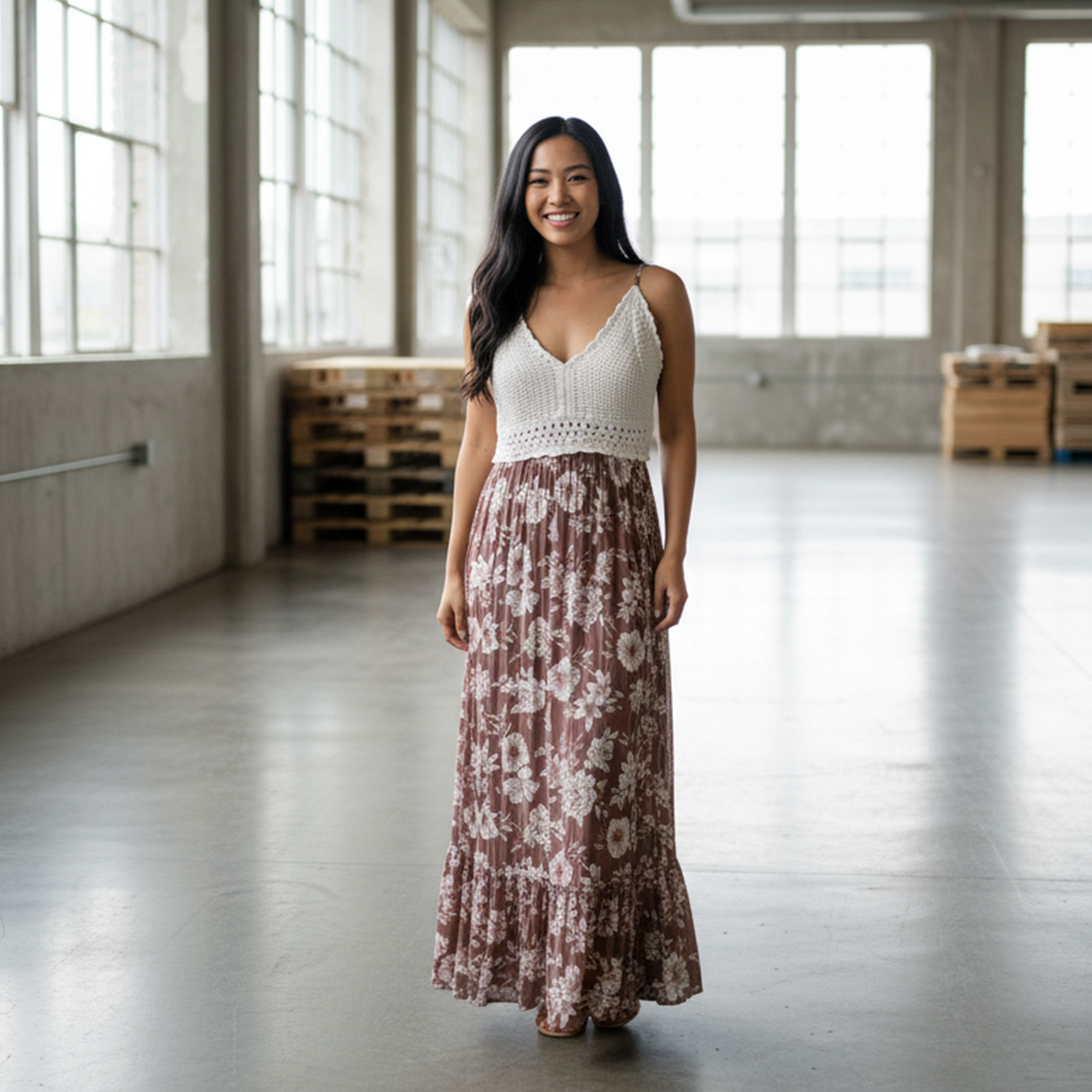 The dress transitions into a flowy maxi skirt in a rich dusty rose (or brown/mauve) color, adorned with a romantic white floral print. The high empire waist creates a flattering, elongated silhouette. Made from light, breathable material, this piece is absolutely perfect for music festivals, resort vacations, or warm-weather weekend adventures. Add this unique piece to your cart for instant bohemian chic.