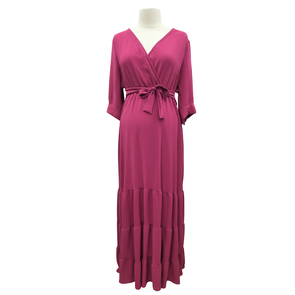The dress boasts a chic wrap-style V-neckline and an adjustable fabric tie at the waist that allows you to customize the fit perfectly. The dramatic tiered skirt adds beautiful texture and movement, creating a voluminous, yet light, maxi silhouette. Finished with easy three-quarter sleeves, this dress is ideal for everything from destination weddings and holiday celebrations to upscale casual events. Dare to wear this dazzling color and step out with confidence.