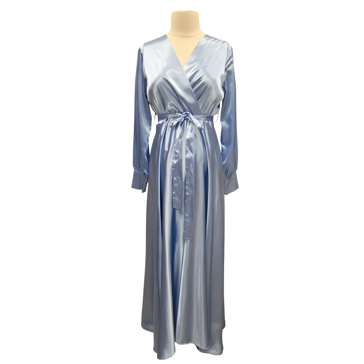 Drift into Dreamy Elegance with the Sky Blue Satin Wrap Maxi Dress.
