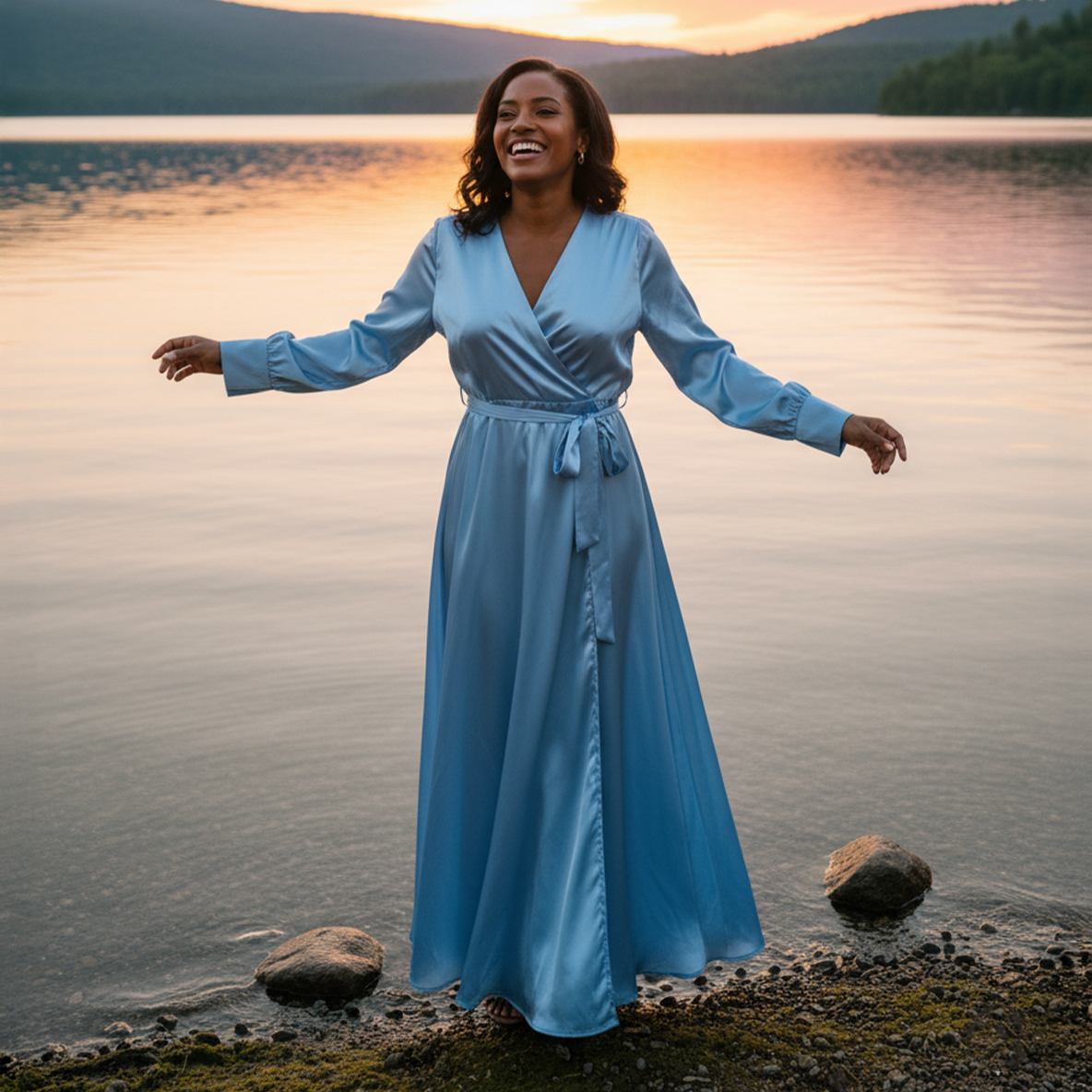The design features a comfortable and universally flattering full wrap silhouette, which easily adjusts to your figure for the perfect fit. The graceful V-neckline and long sleeves with neat cuffs add a polished sophistication, while the matching satin waist sash beautifully defines your waist. Ideal for a spring wedding, a special anniversary, or a formal seaside event. Capture the light and make a breathtaking entrance in this unforgettable shade.