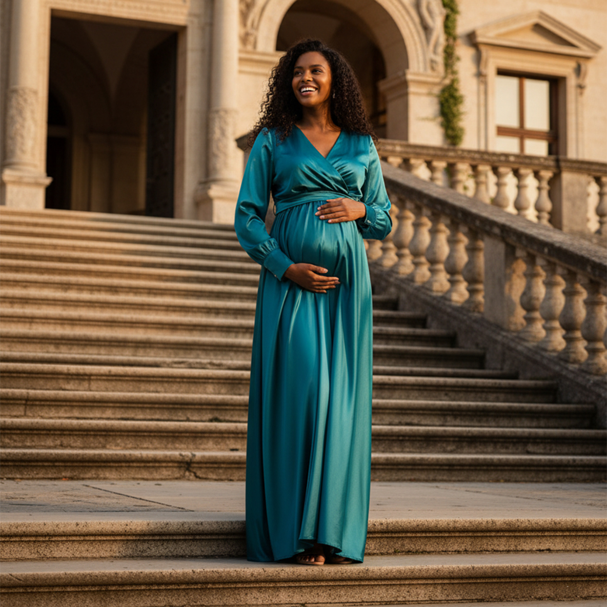 Unveil Your Inner Jewel in the Teal Satin Long Sleeve Maxi Dress.