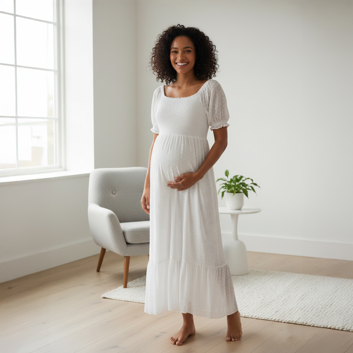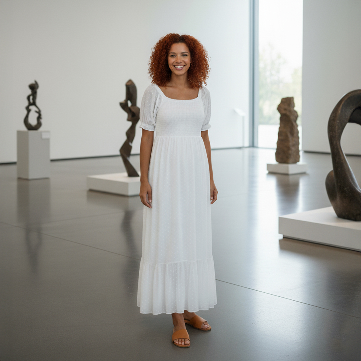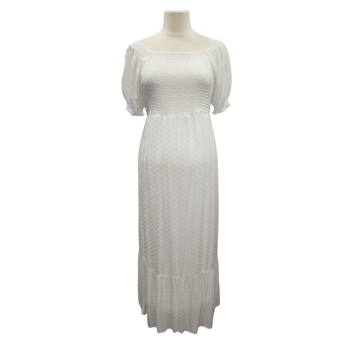 Ethereal Charm in the White Smocked Dot Maxi.