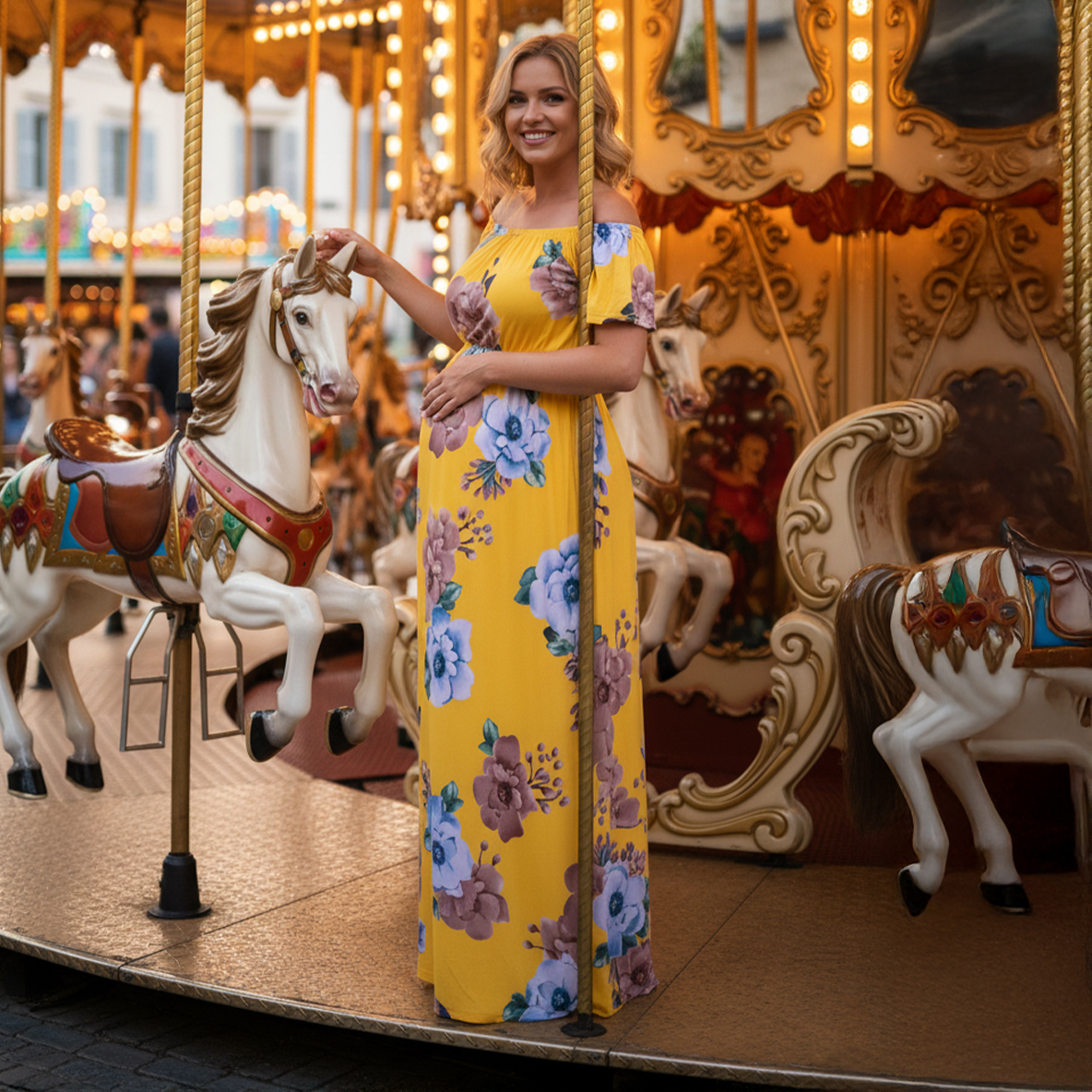 Brighten your day with this effortlessly beautiful gown that combines vibrant color with a romantic print. The bold sunny yellow background features large, elegant blossoms in soft mauve and dusty blue, creating a unique and sophisticated contrast.